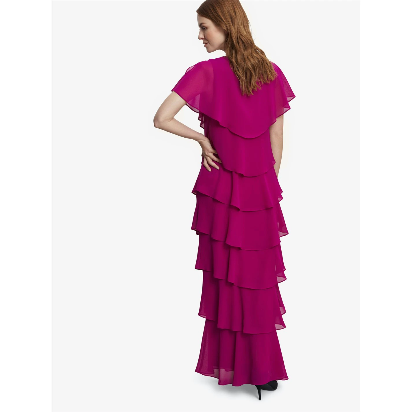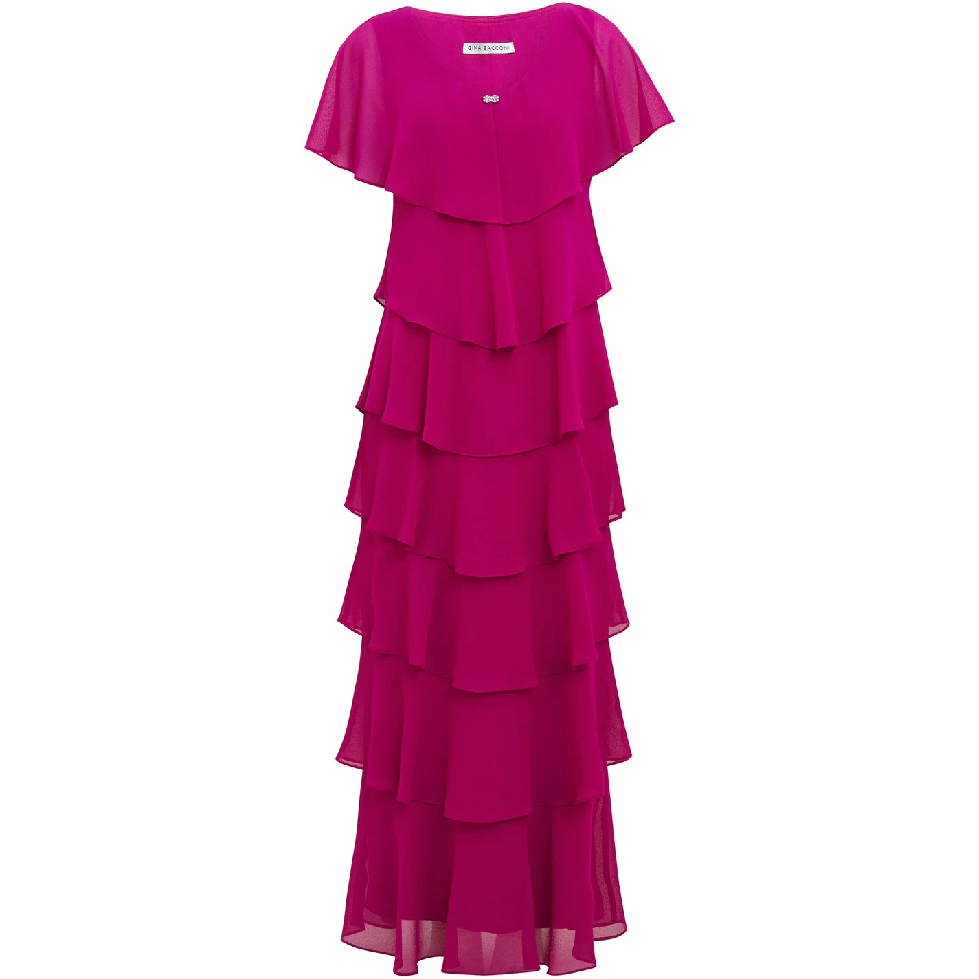 Feel wonderful in this maxi floaty tiered cape dress by Gina Bacconi. This dress takes a modern and flattering shape in layered pebble georgette with diamante detailing at the neck. Perfect for an event, this piece offers both comfort and elegance.