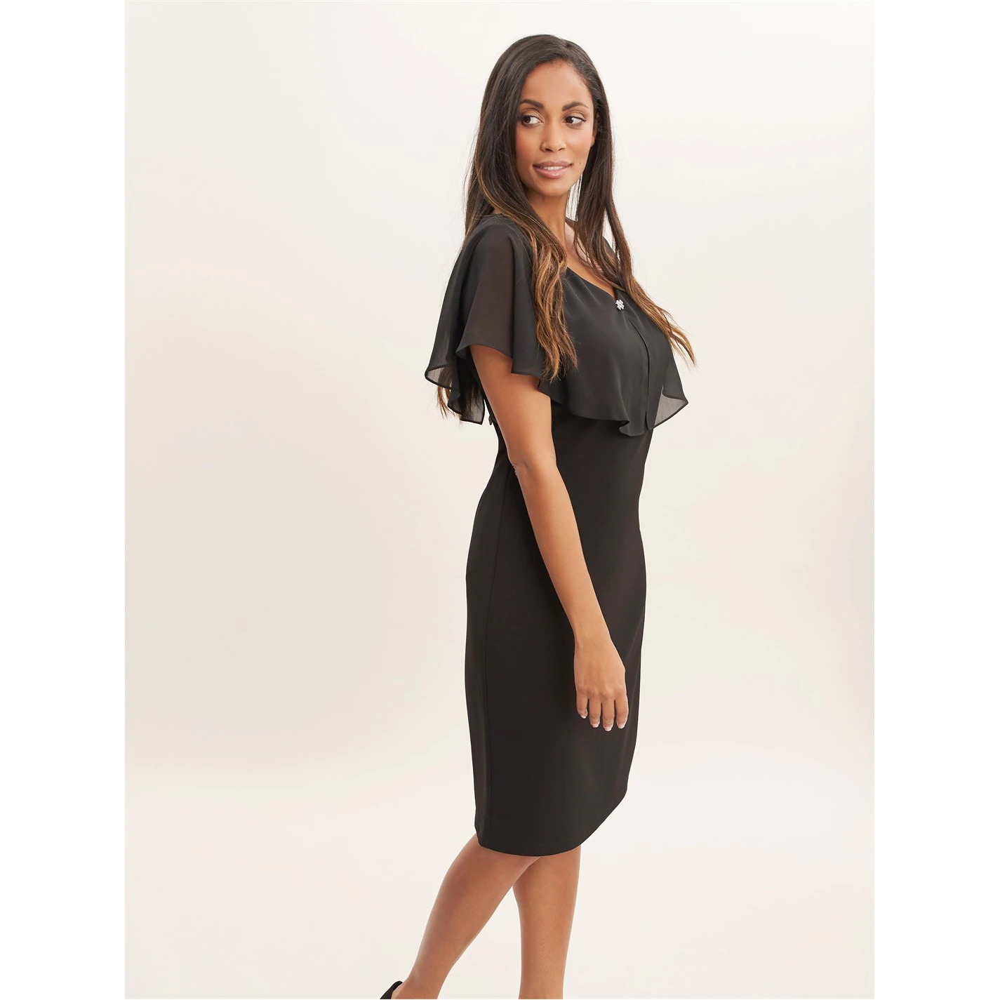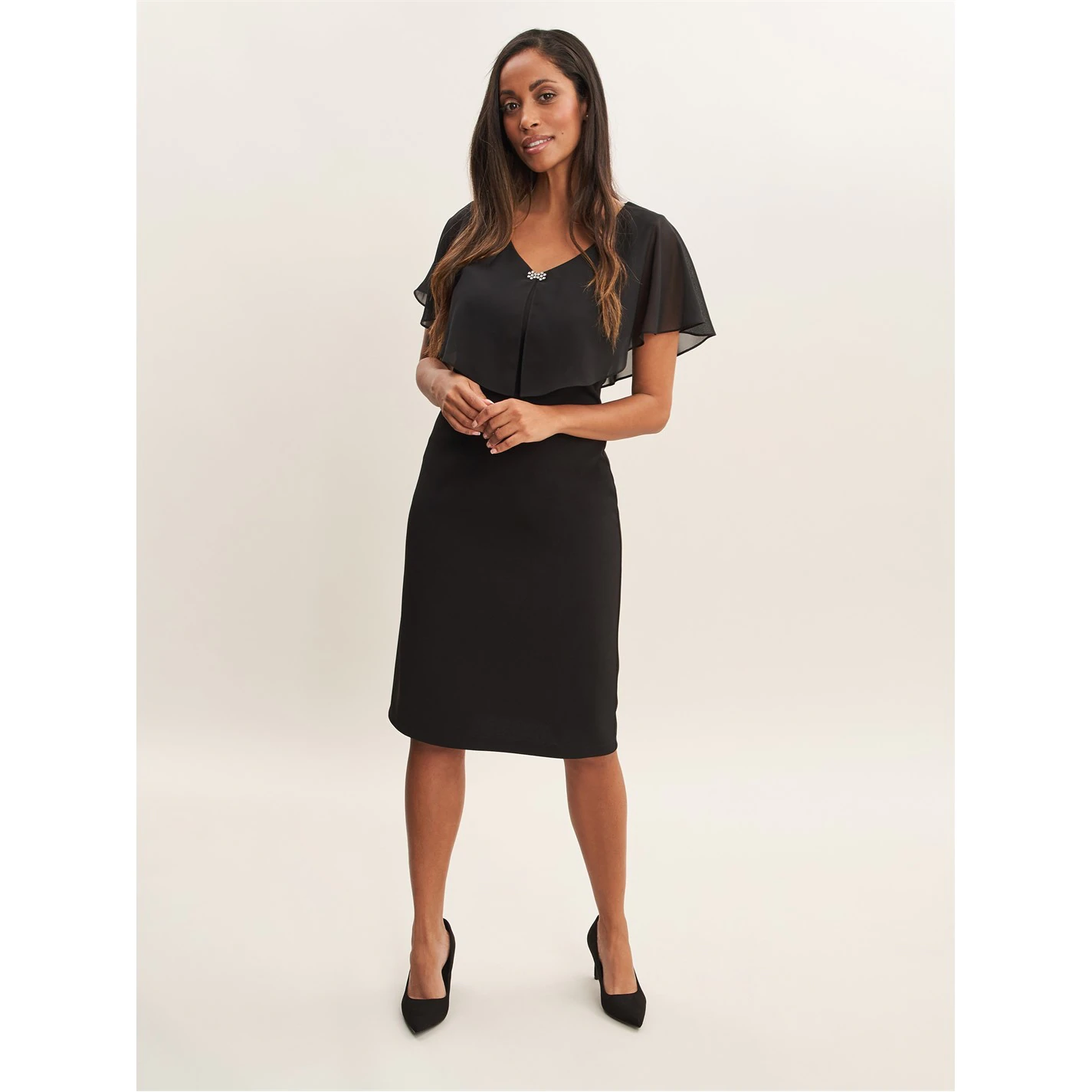 The perfect little black dress, this strech crepe dress with attached chiffon cape at the neck is timeless and stylish. Showcasing a diamante trim at the base of the V-neck, this is a warbrobe essential that can be worn over and over for all events. It features a zip at the centre back.