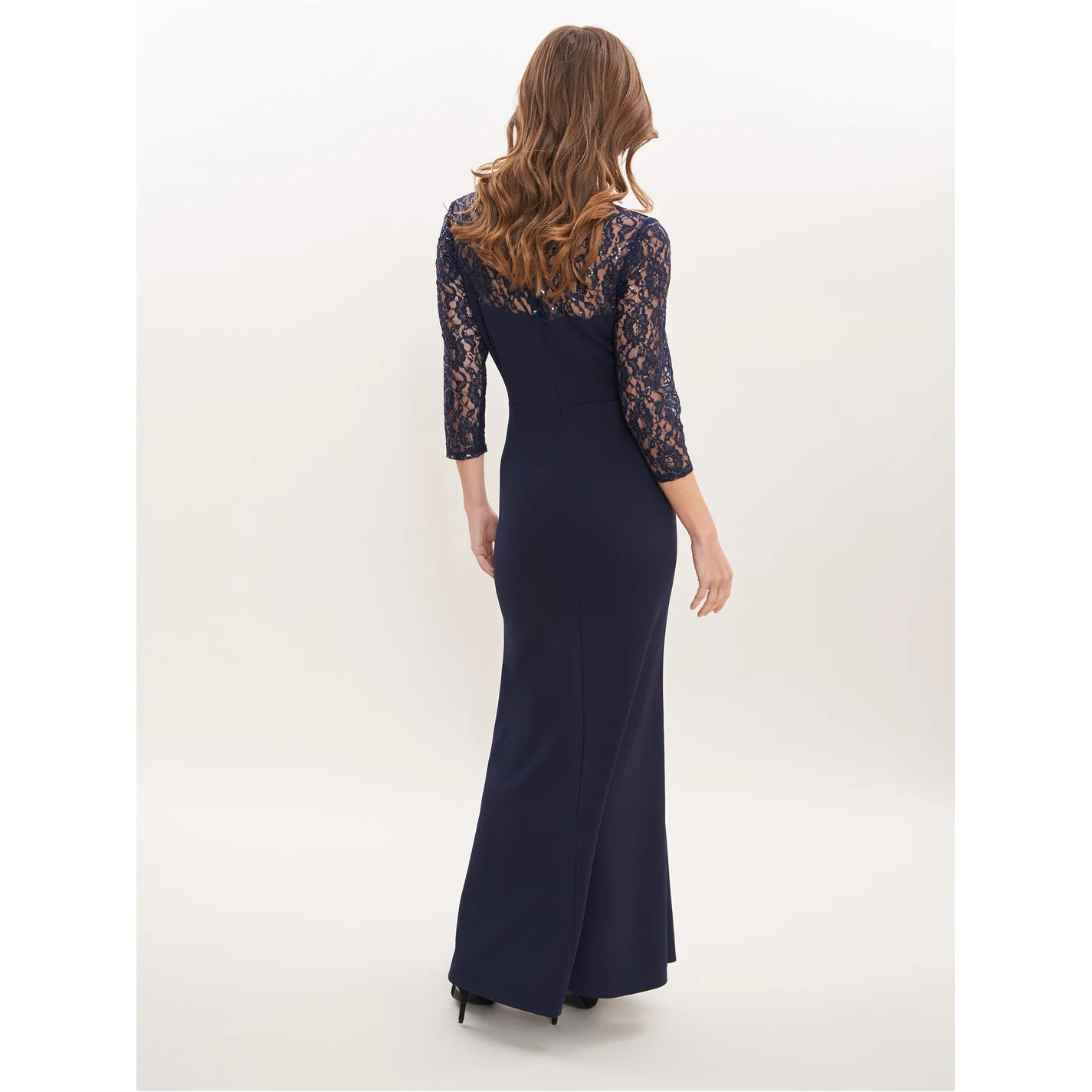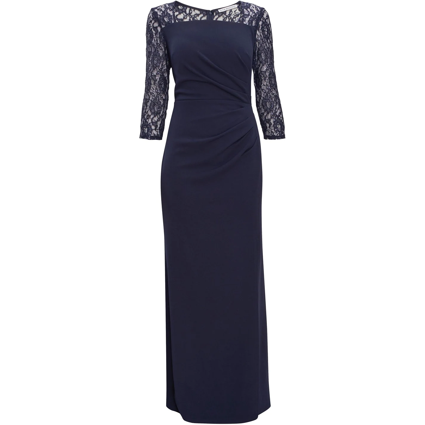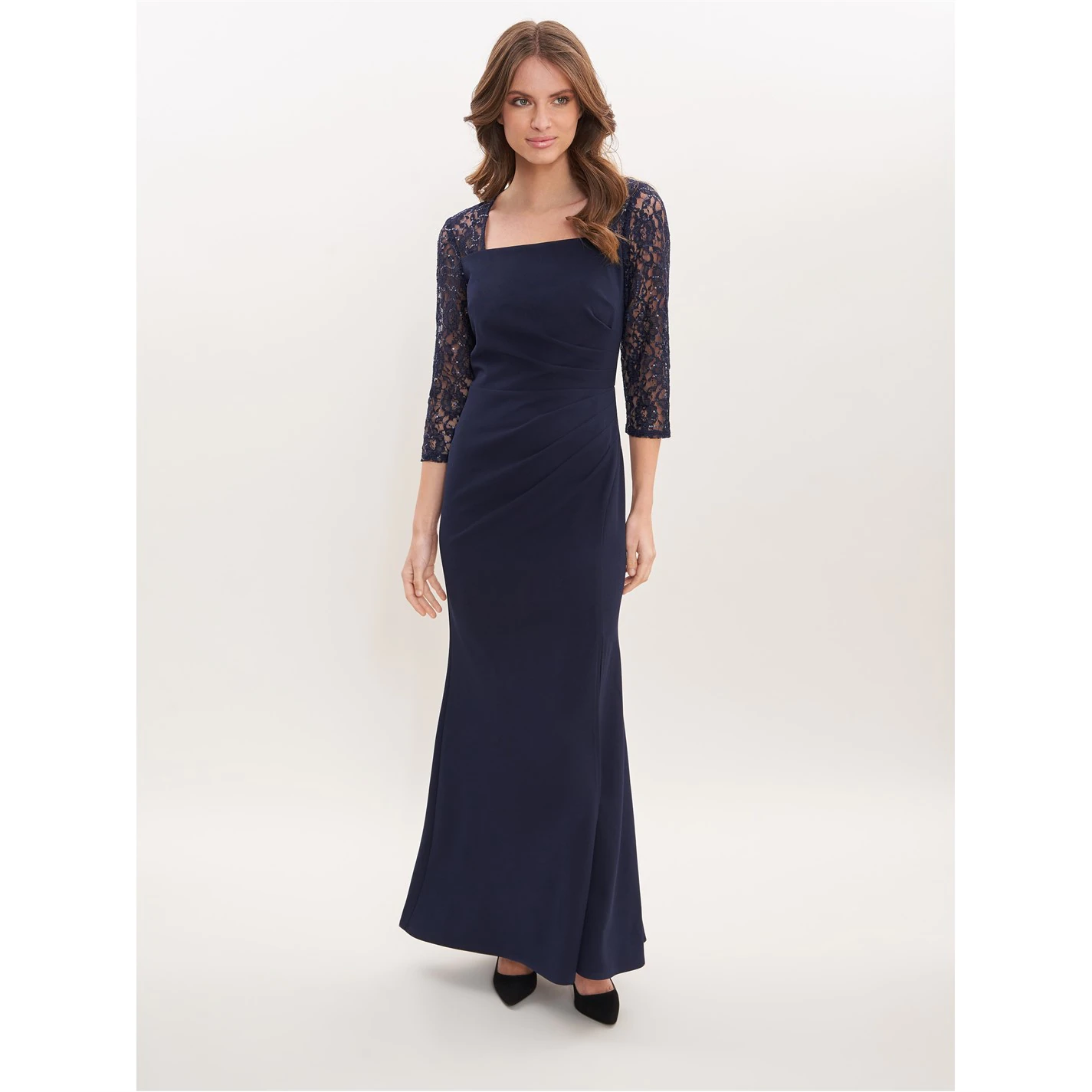 Elegant square neck crepe gown with front slit and lace sleeves and illusion lace back.
